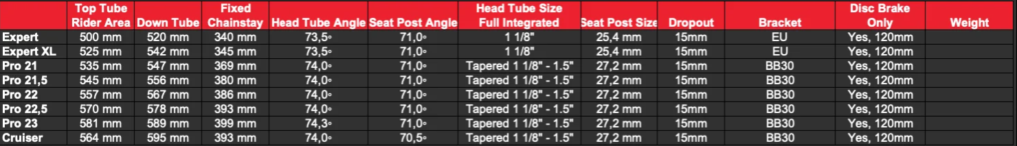• Гидроформованные трубки с несколькими стыками 6061 T-6; • коническая головная трубка 1,5 мм; • Широкий корпус BB для оптимальной жесткости; • Дисковый тормоз, установленный непосредственно на раме; • Прочная опора цепи Meybo с фиксированными задними выступами 15 мм; - Гарантируйте, что длина опоры цепи всегда будет одинаковой, на какой бы передаче вы ни работали! - Простая, быстрая и прямая установка заднего колеса! • Система натяжения цепи Meybo; • Задняя ось 7005 с ЧПУ 15 мм; • Размеры Expert, Expert XL, Pro 21, Pro 21.5, Pro 22, Pro 22.5, Pro 23, Cruiser.